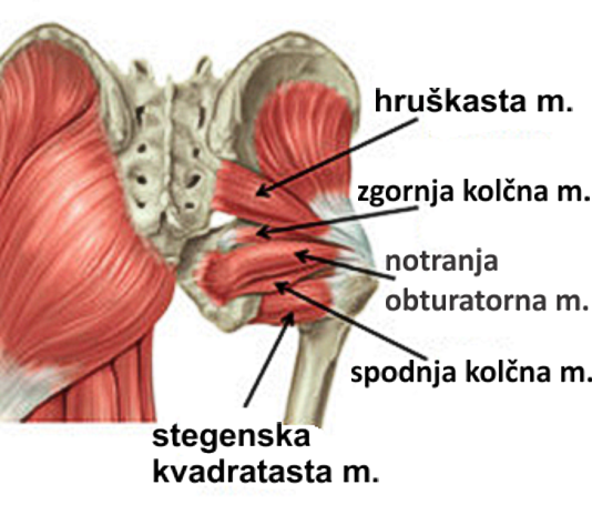 Skozi naše kolke potuje okoli 20 mišic (mišice primikalke in odmikalke nog, fleksorji kolka v sprednjem delu, globoki zunanji rotatorji v zadnjem delu in še drugi).